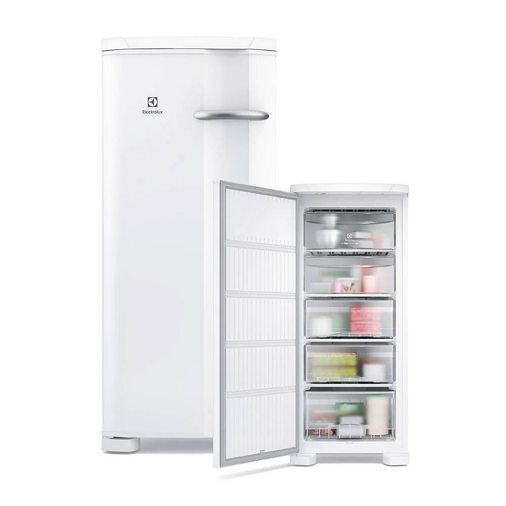 Freezer Vertical Electrolux 162L com Tecnologia Inverter, novo design, puxador ergonômico, portas reversíveis, prateleiras internas, cestas de arame, pés com nivelador e gás refrigerante ecológico.