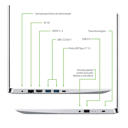 Chega de esperas! Concentre-se no que realmente importa com um notebook que acompanha o seu ritmo. Imagens Vivas e Nítidas A tela de 15.6” Full HD IPS oferece uma experiência visual incrível, com cores vibrantes e detalhes nítidos de qualquer ângulo. A tecnologia Acer ComfyView reduz os reflexos, garantindo maior conforto visual mesmo após longas horas de uso. Design Elegante e Funcional Com um acabamento premium na cor prata, o Aspire 5 é tão elegante quanto potente. Seu design fino e leve permite que você o leve para qualquer lugar, enquanto a dobradiça elevada melhora a refrigeração e proporciona uma digitação mais confortável.